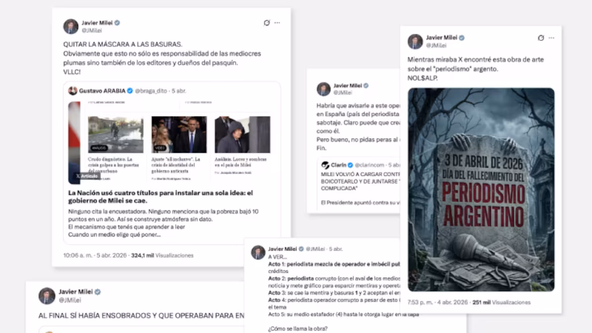 La domenica 5 aprile, Milei ha pubblicato su Clarín un articolo di sua firma dedicato all’economista Adam Smith. Nello stesso momento, il suo profilo su X manteneva fissato un messaggio critico nei confronti della stessa testata. Nel corso della giornata ha rinnovato le critiche al quotidiano, commentando alcune sue pubblicazioni. Ha anche espresso riserve sulla prima pagina cartacea de LA NACION, definendo la testata un “pasquino” e accusandone redattori e proprietari di essere parte di una “associazione a delinquere”.